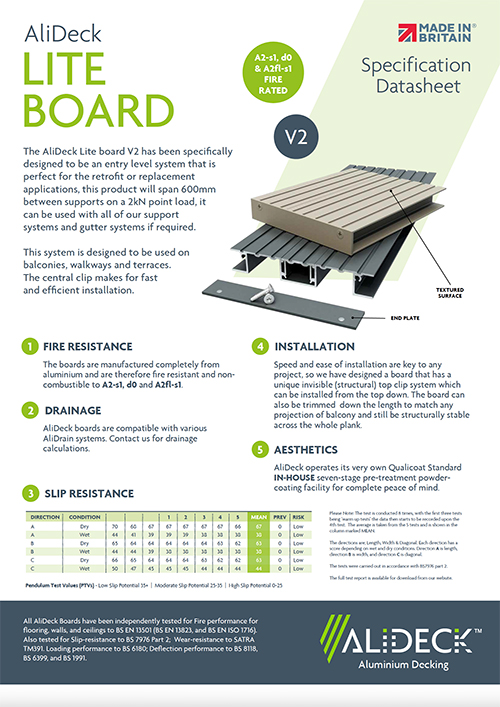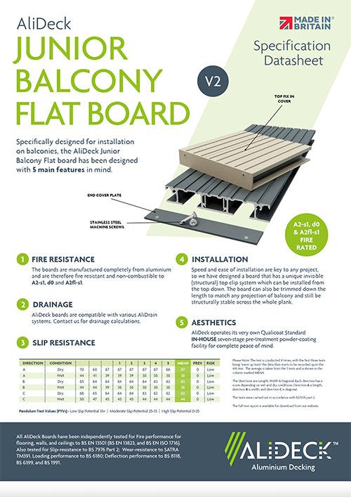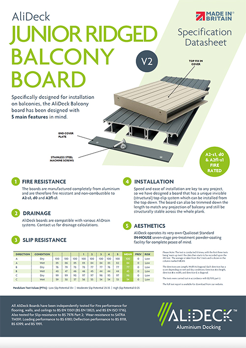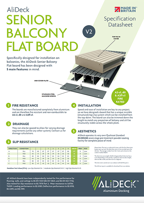 Independently fire-safety tested to EN 13823, EN 13501 and EN ISO 1716, all elements of the AliDeck System achieve Euroclass Classifications of A2-s1, d0 and A2fl-s1, satisfying legal requirements and ensuring compliance for new build and retrofit projects. Additionally, AliDeck decking boards have undergone Slip Resistance testing and all AliDeck boards have been certified as “Low Risk” for slips in wet and dry conditions.
