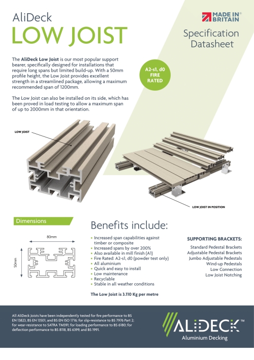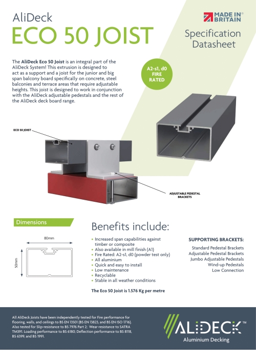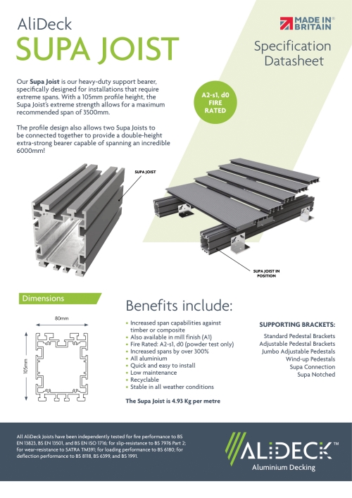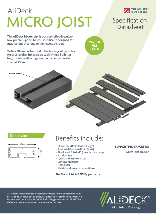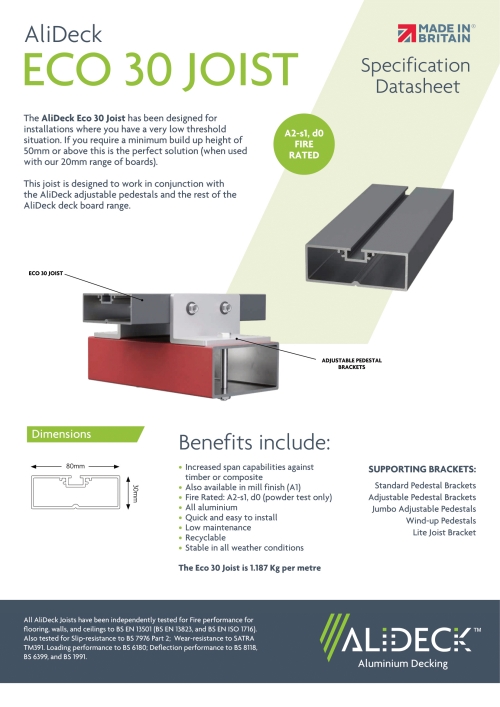 The AliDeck System is a fully-tested, certified, and compliant range of products. With a host of 20mm and 30mm decking boards available in flat or ridged specification, along with a range of support joists, the AliDeck System is suitable for all walkway or rampway applications.