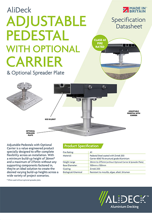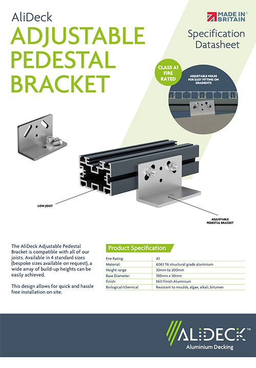 The AliDeck System is a family of configurable aluminium metal decking products, including decking boards, joists, pedestals and accessories. With all elements of the AliDeck System being compatible with each other, total flexibility is provided to cope with any balcony, terrace or walkway decking situation.